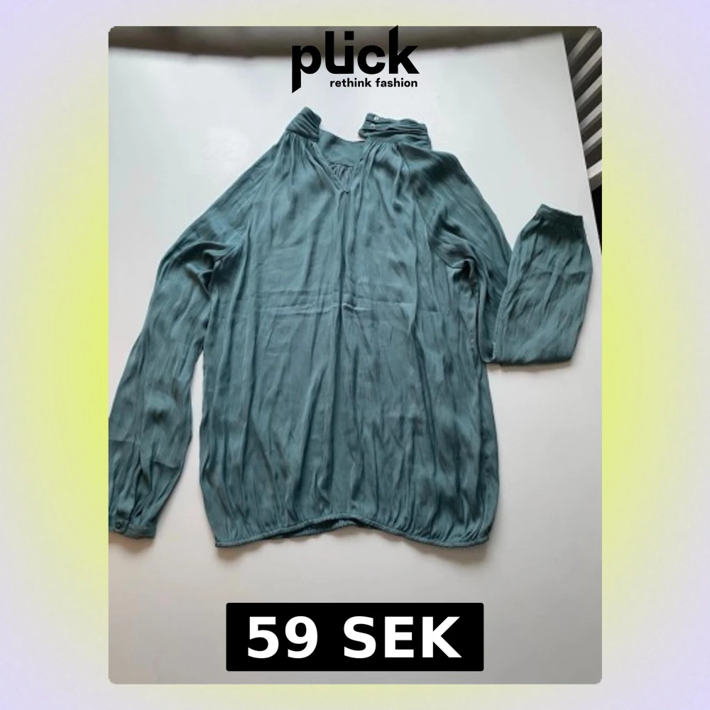 Snygg blågrön blus i ett tunt, mjukt tyg med v-ringning och lätt rynkad krage. Blusen har långa ärmar med knapp vid ärmslut och avslappnad passform. Perfekt att styla med jeans eller kjol för en trendig look.