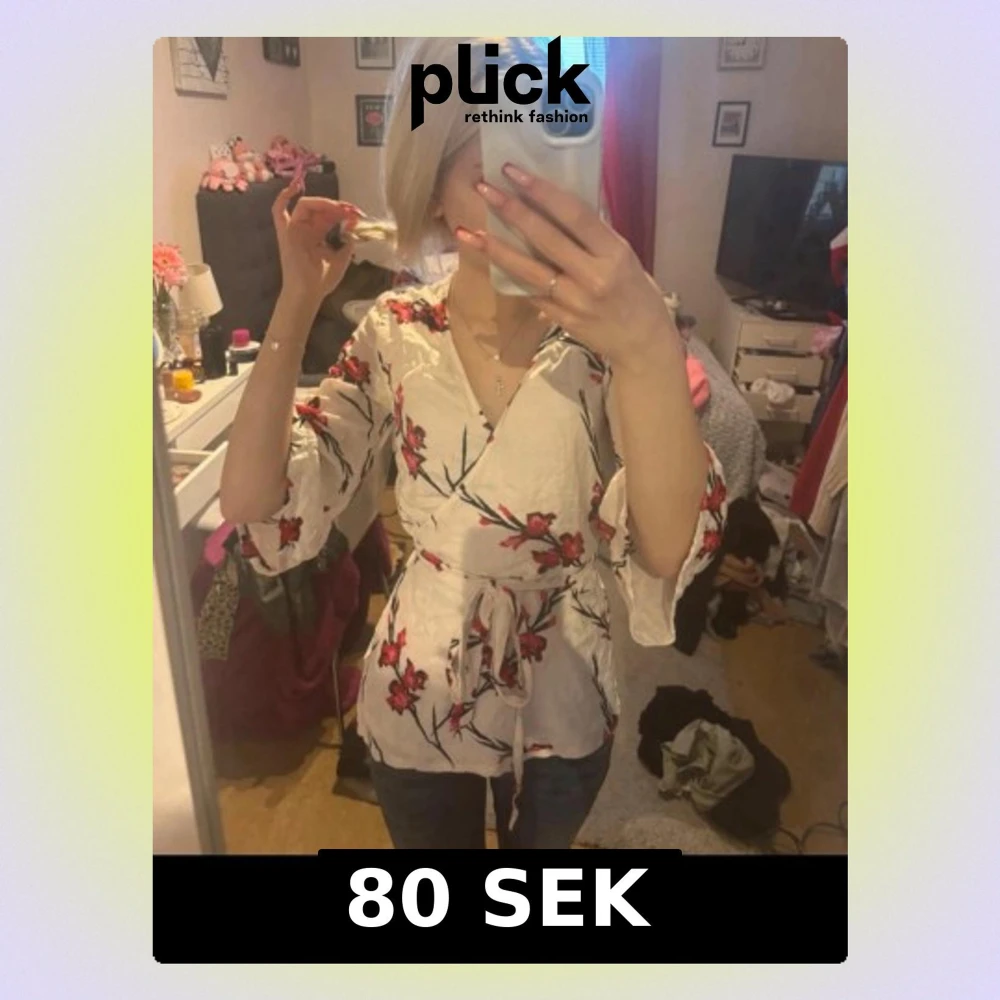 Snygg vit omlottblus med rosa och röda blommor samt svarta grenar. Blusen har trekvartsärmar med volang och knytskärp i midjan för en feminin siluett. Perfekt för att lyfta din outfit med en romantisk touch.