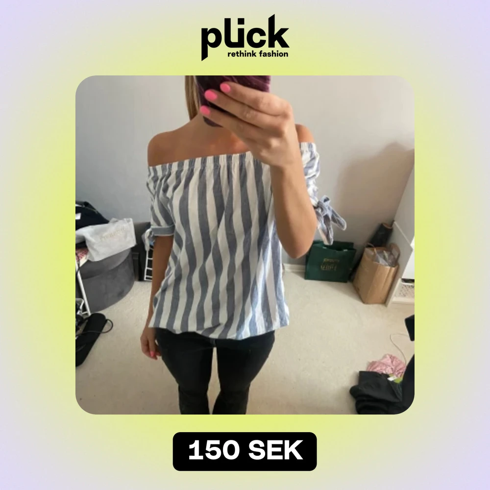 En jättefin randig off shoulder tröja. Står inget märke eller storlek så vet tyvärr inte de💕Men skulle säga att tröjan funkar som xs/s