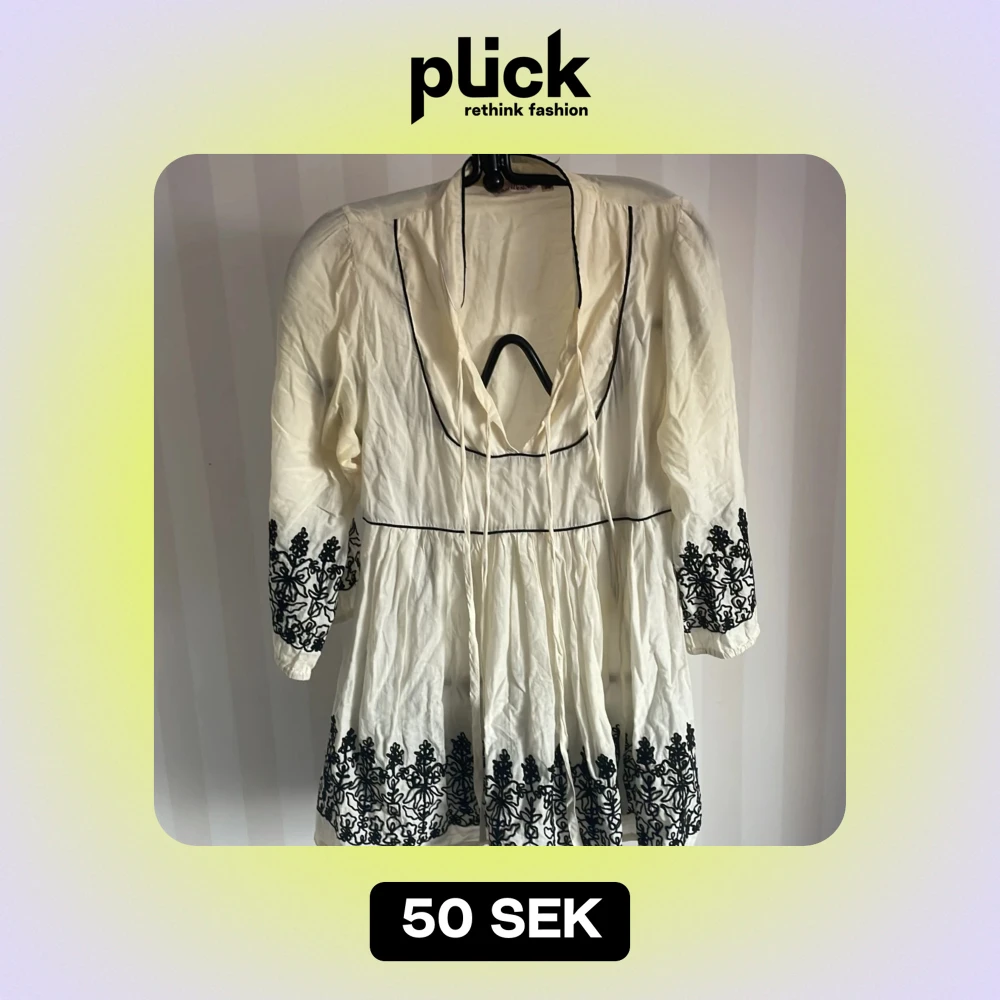 Charmig vit tunika från EastWest i storlek 34. Den har vackra svarta broderier längs ärmarna och nederkanten. Tunika är långärmad och har en avslappnad passform med knytband vid halsen. Perfekt för vår och sommar! Legat i garderoben och i behov av tvätt , se bilder.