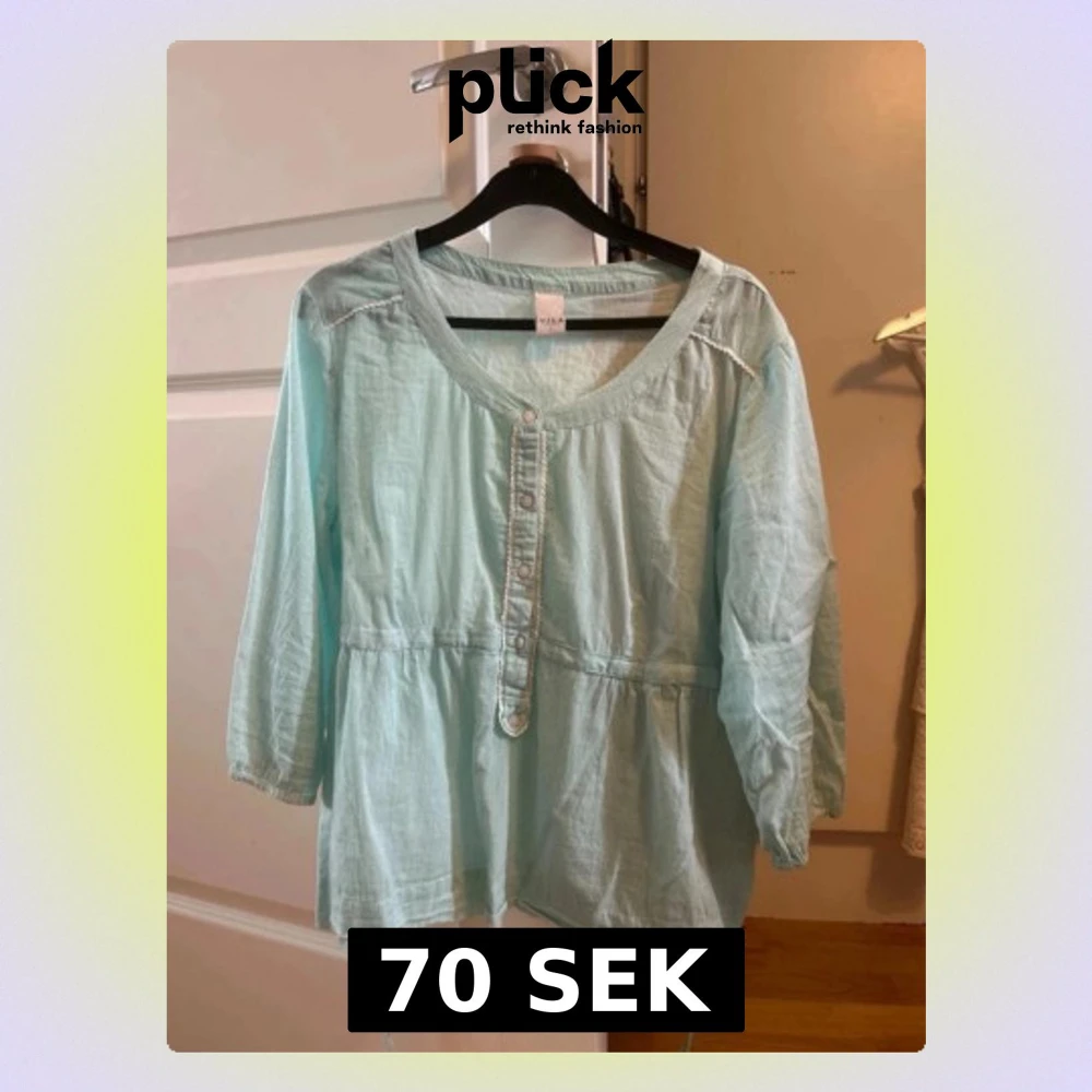 Jätte fin turkos blus från Vila i storlek L, dock liten i storlek så skulle passa någon som är runt M. Har även ett band som man kan knyta i bak, otroligt fin😍
