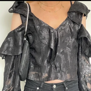 Svart glittrig blus - Supersnygg svart blus som är glittrig. Blusen har korta ärmar som är volangiga och rund halsringning, perfekt på fester. Materialet är mjukt och skimrande, vilket ger en lyxig känsla. Aldrig andvänt. Pris kan diskuteras