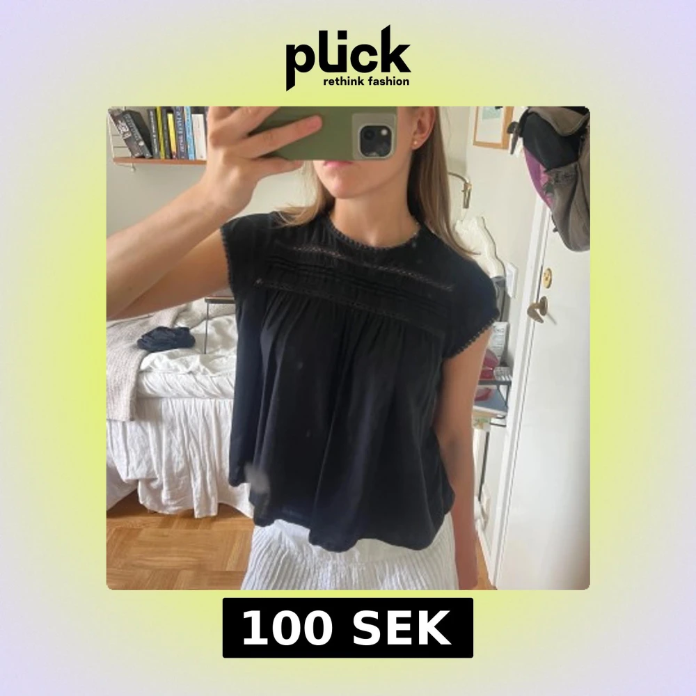 Svart blus med fina spetsdetaljer vid halsringning och över bröstet. Blusen har en lös passform och lätt rynkade partier framtill. Perfekt med både jeans och kjol💓💓