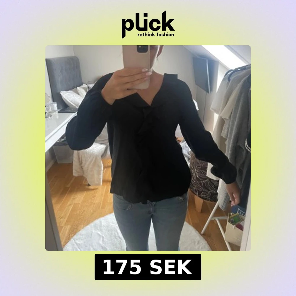 Säljer en svart långärmad blus från vero Moda. Den är v-ringad och har volanger runt och rakt ner på magen. Den har ett tunt och luftigt material. Har använt ett fåtal gånger och säljer då ja inte använder den☺️