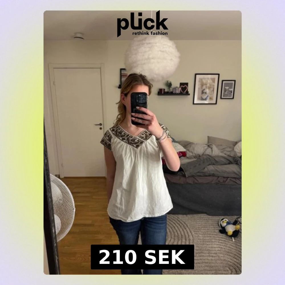 Superfin och luftig vit blus med vackert mörkbrunt/svart broderi runt halsringningen och ärmarna. Blusen har en smickrande V-ringning och en lös, bekväm passform. Perfekt för sommarens fester, semestern eller till ett par snygga denim-shorts. Ett måste för dig som gillar den bohemiska stilen! • Stil: Boho / Folkloristisk • Storlek: Uppskattas till S/M (se bild för passform) • Skick: Fint begagnat skick.