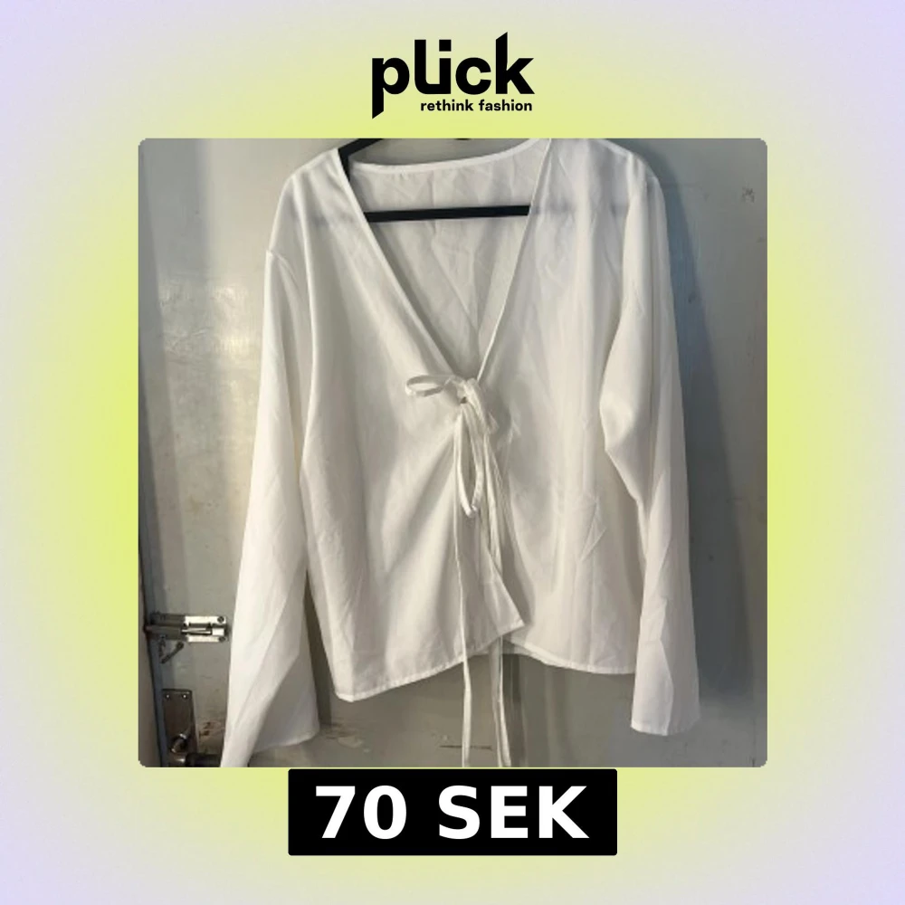 Säljer en stilren vit blus med långa ärmar och v-ringning. Den har knytband framtill som ger en snygg detalj och gör att du kan justera passformen. Perfekt att matcha med jeans eller kjol för en clean look. Funkar även som en kofta då snörena går att öppna