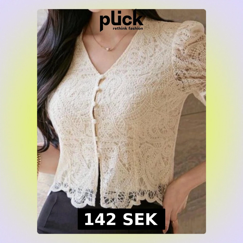 Söt spetsblus med puffiga korta ärmar och dekorativa knappar framtill. Blusen har ett vackert spetsmönster, V-ringning och vågig kant nertill. Perfekt för dig som gillar romantisk och feminin stil. Materialet är genombruten spets i polyester.