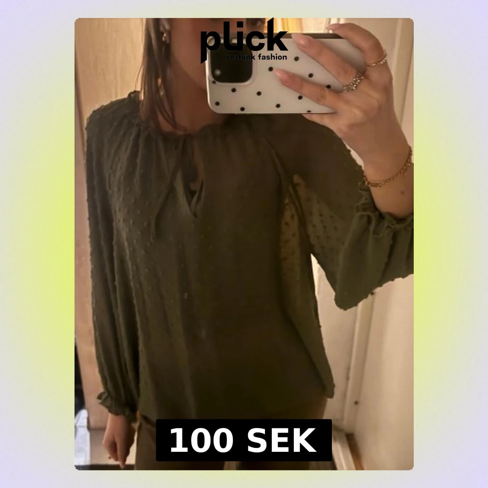 Snygg olivgrön blus med diskret prickstruktur och knytning vid halsringningen. Blusen har långa ärmar med resår och volangdetalj vid ärmslut. Tunt, lätt och flowy material som ger en avslappnad look.