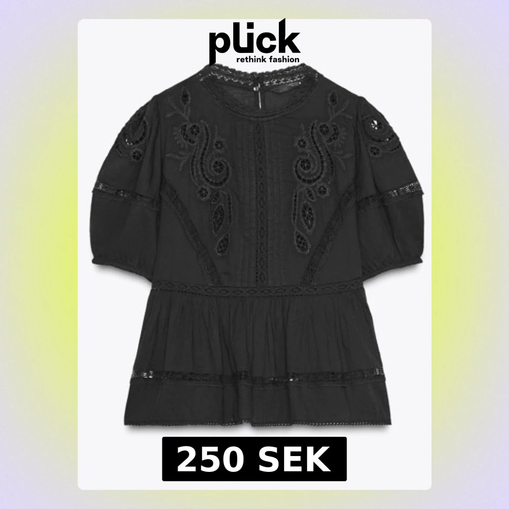 Svart blus med vackra broderier och spetsdetaljer framtill och på ärmarna. Blusen har rund halsringning, korta puffärmar och en lös, volangig passform. Tillverkad i ett lätt tyg som ger en luftig känsla.