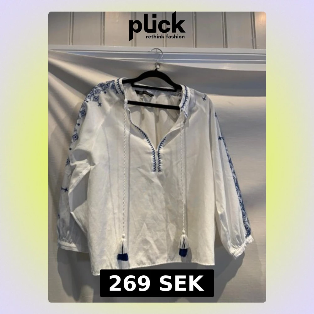 Vit bohemisk blus från Zara med blå broderade detaljer längs ärmar och axlar. Blusen har långa ärmar, snörning med tofsar vid halsen och avslappnad passform. Tillverkad i ett lätt bomullstyg som känns luftigt och skönt.
