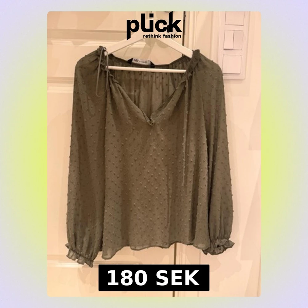Olivgrön blus från ZARA med lång ärm, lätt transparent tyg och små prickar i strukturen. Blusen har v-ringning med knytband vid halsen och volangdetaljer vid ärmslut. Perfekt för en trendig och avslappnad look.