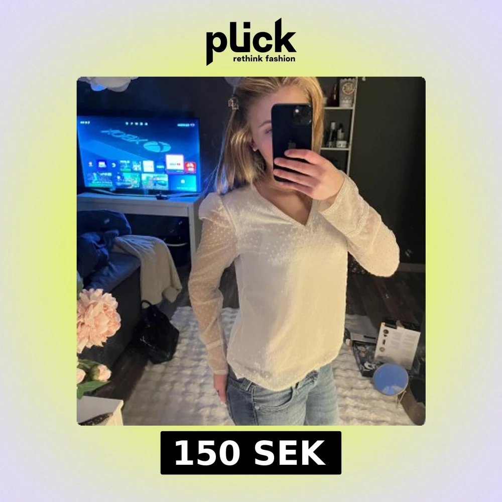 Säljer en söt vit långärmad topp med diskret prickigt mönster. Toppen har en v-ringad hals och är perfekt för en stilren look. Passar bra till jeans eller kjol för en avslappnad stil.