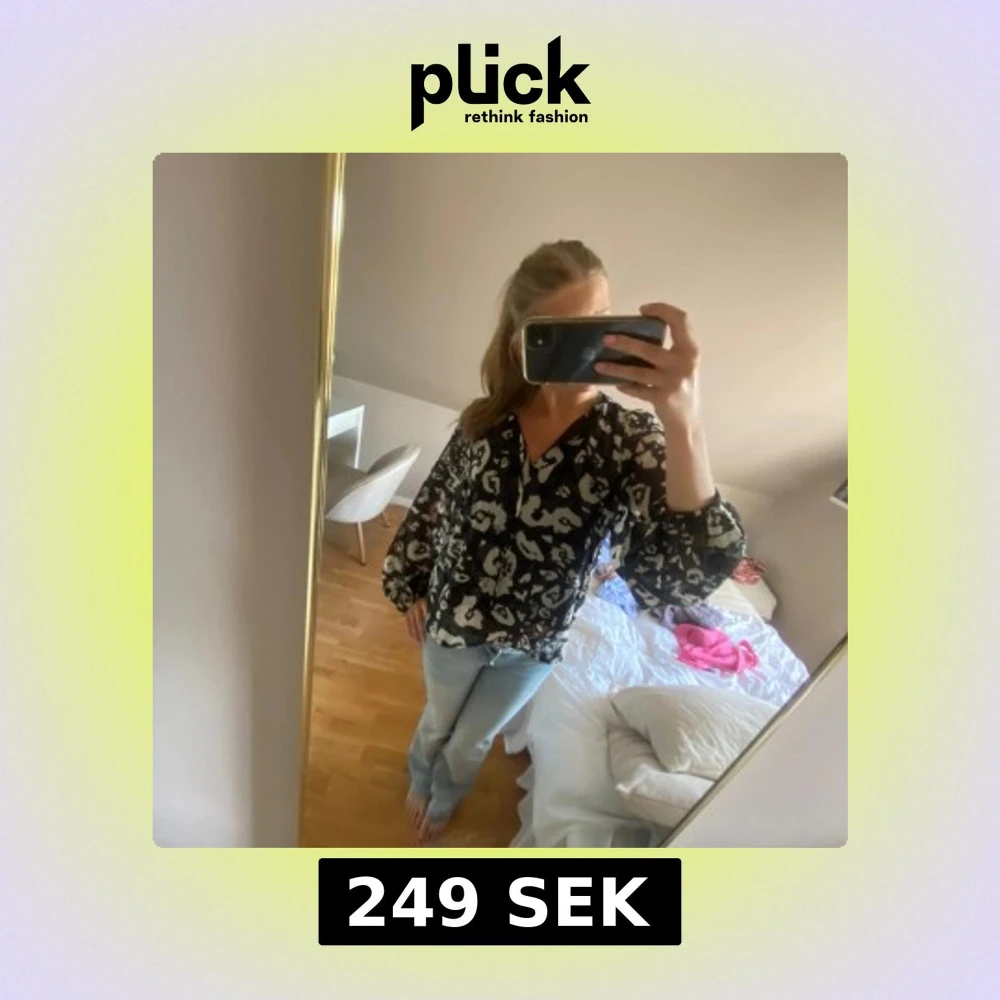 Säljer en luftig svart blus med vita blommiga mönster och v-ringning. Blusen har långa, vida ärmar. Aldrig använd😚