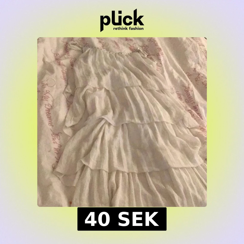 Säljer en söt vit klänning med flera lager av volanger och pärldetaljer vid halsen. Klänningen har tunna axelband och en luftig design, perfekt för varma dagar. Den är tillverkad i ett lätt och bekvämt material.