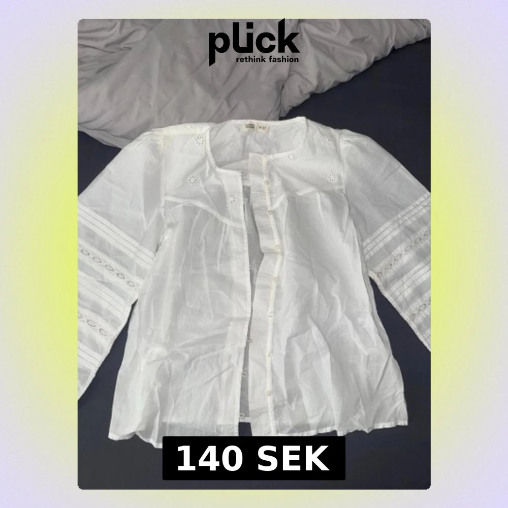 Säljer en luftig vit blus med fina spetsdetaljer på ärmarna och broderade hålmönster vid axlarna. Blusen har knappar framtill och är tillverkad i ett tunt, mjukt bomullstyg. Perfekt för dig som gillar romantisk och bohemisk stil.