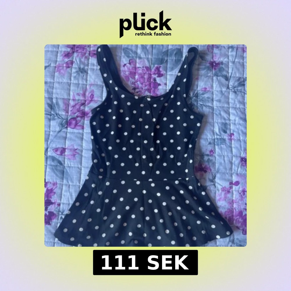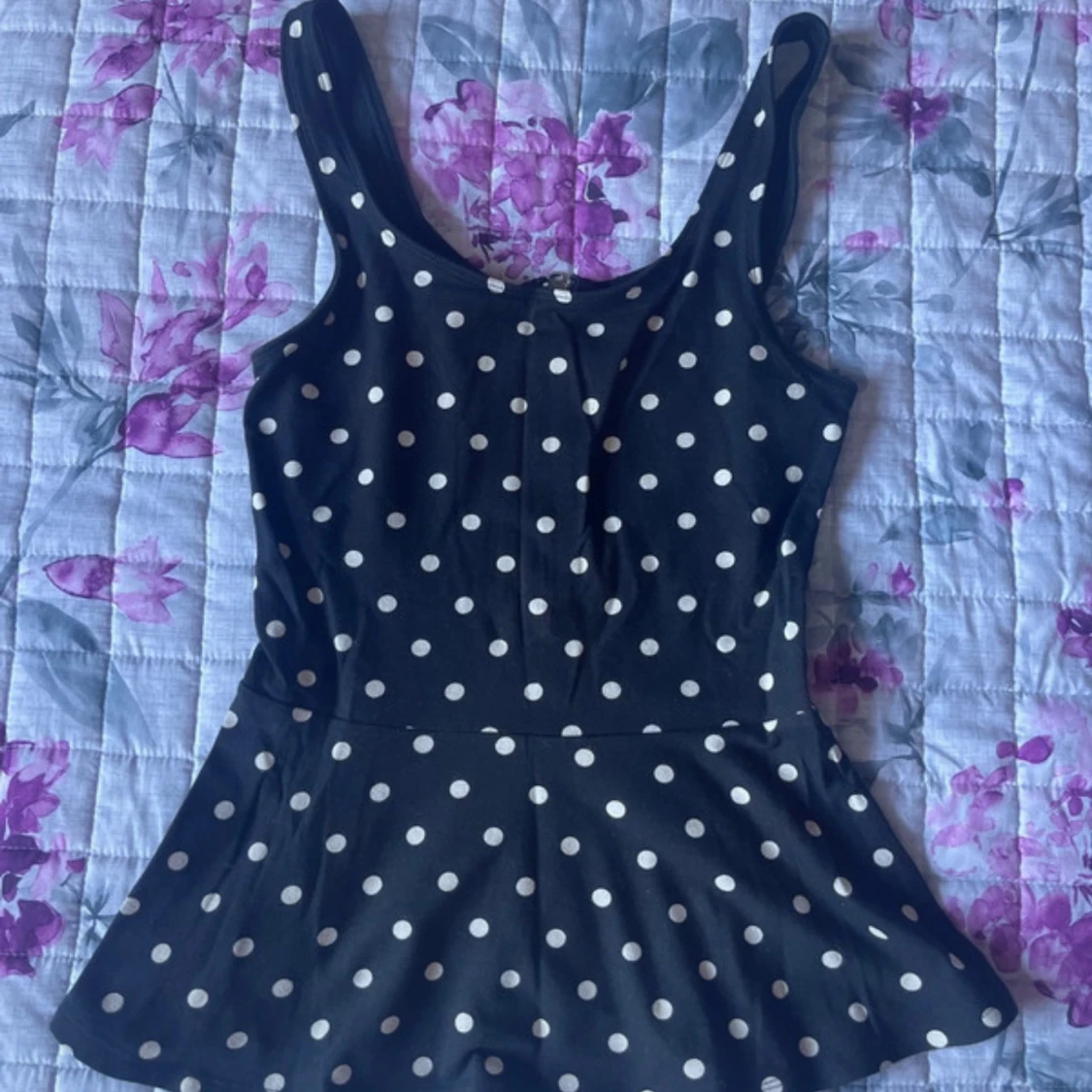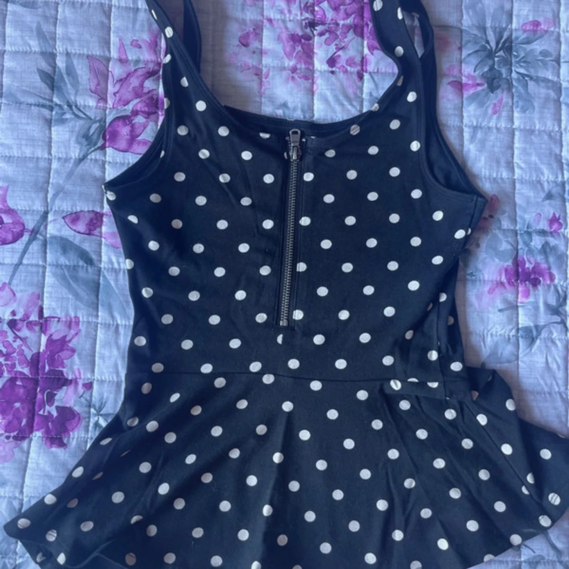 Supersöt svart baddräkt med vita prickar och en snygg dragkedja i ryggen. Modellen har breda axelband och en liten volangkant nedtill som ger en retrovibe. Perfekt för stranden eller poolen i sommar!