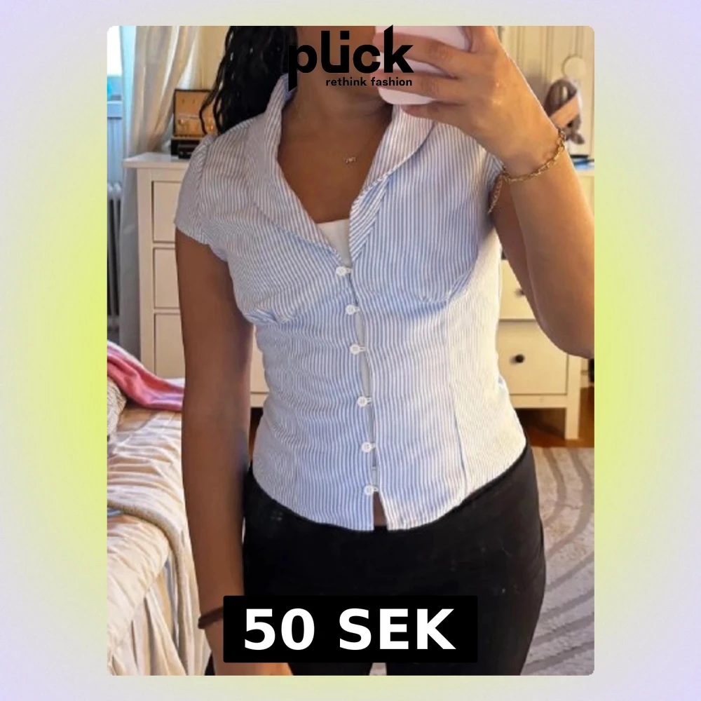 Säljer en snygg blus med blå och vita ränder, korta ärmar och klassisk krage. Blusen har en figurnära passform och knäppning framtill med vita knappar. Perfekt för dig som gillar stilrena och fräscha plagg.