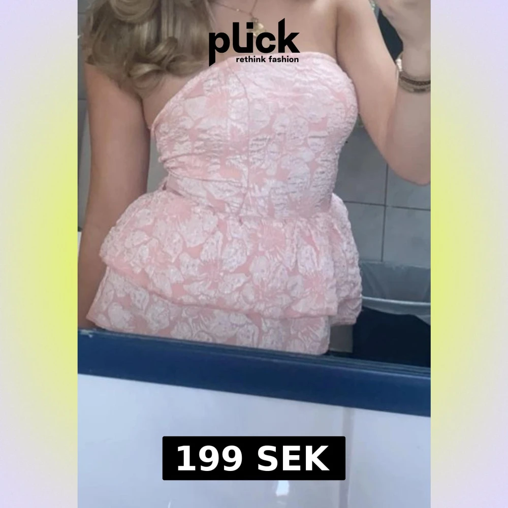 Supersöt axelbandslös topp i ljusrosa med vitt blommönster och volangdetalj i midjan. Knytning i ryggen, skriv vid intresse av bilder