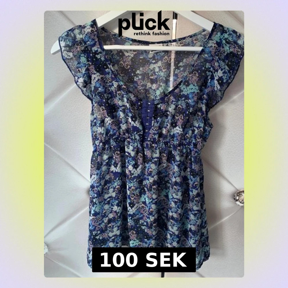 Söt blommig blus i blå toner med transparent material och volangärmar. Blusen har knappar framtill och ett lätt utställd passform. Perfekt för dig som gillar en luftig och somrig stil. Materialet känns tunt och flowy.