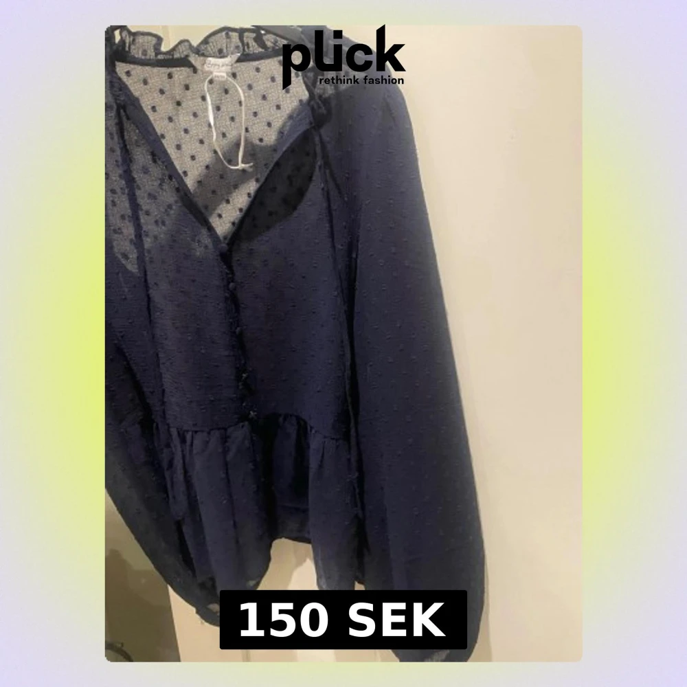 Säljer en mörkblå blus från Happy Holly med transparenta partier och små prickar i tyget. Blusen har v-ringning, knappar framtill och volangdetalj nedtill. Långa ärmar med resår vid ärmslut ger en luftig och trendig look. Helt ny aldrig använd dock utan pris lapp