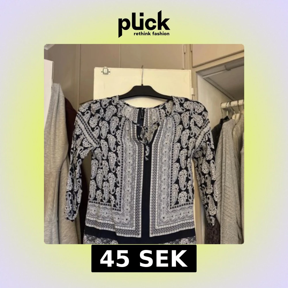 Säljer en blåvit blus som har trekvartsärm och knytning vid halsen. Perfekt för dig som gillar boho-vibe och vill ha något unikt i garderoben.