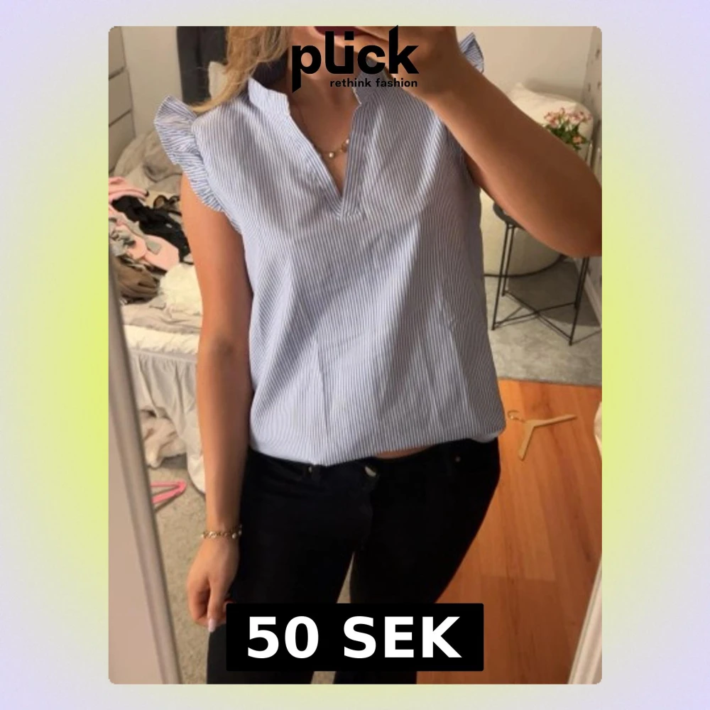 Snygg blus med tunna blå och vita ränder, korta volangärmar och v-ringad hals. Lätt och luftig modell som ger en fräsch look. Perfekt till jeans eller kjol. Materialet känns mjukt och bekvämt mot huden.