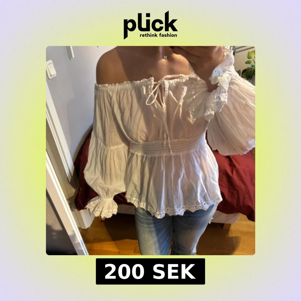 Säljer en vit offshoulder blus med långa vida ärmar och spetsdetaljer vid ärmslut och nederkant. Blusen har knytning framtill och smock i midjan för en feminin siluett. Perfekt till jeans eller kjol! Passar även S