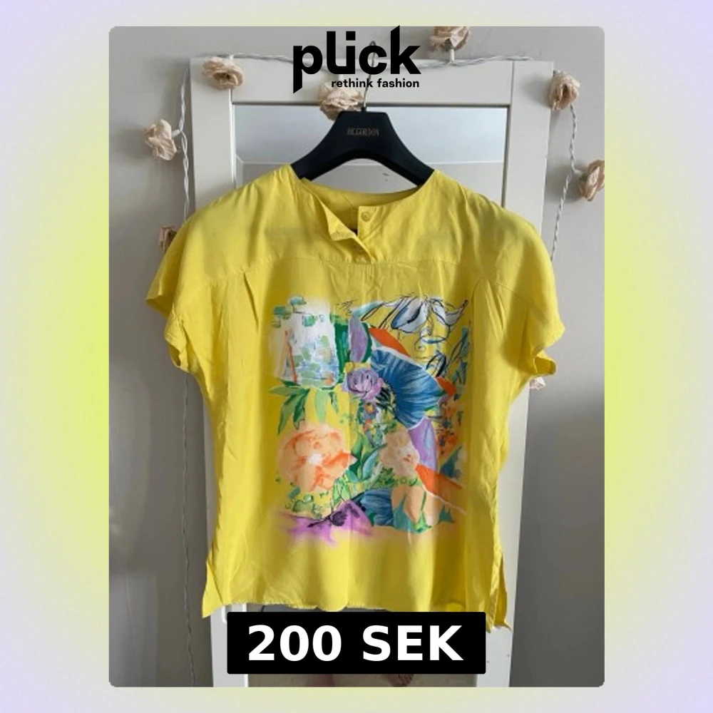 Snygg Tuzzi gul blus med korta ärmar och färgglatt blommigt tryck framtill. Blusen har en liten knappdetalj vid halsen och ett mindre tryck på ryggen. Perfekt för dig som gillar färg och vill sticka ut lite extra. Materialet känns lätt och luftigt.vet inte vad det är för material,tror det är bomull .