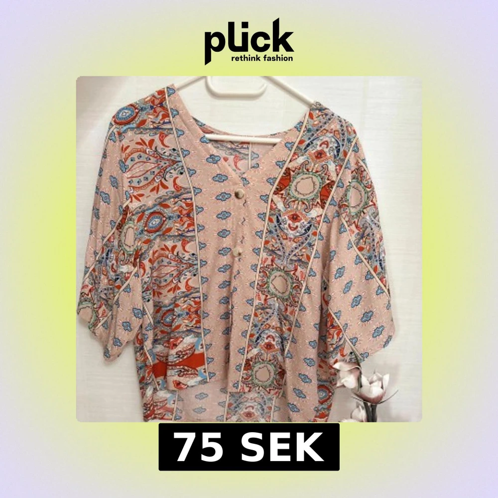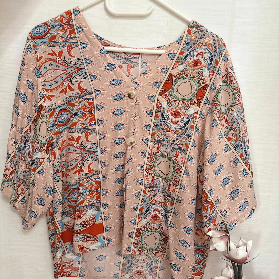 Säljer en luftig blus med vackert paisleymönster i beige, blått, rött och grönt. Blusen har v-ringning, knappar framtill och vida trekvartsärmar. Perfekt för dig som gillar bohemisk stil och färgglada detaljer.