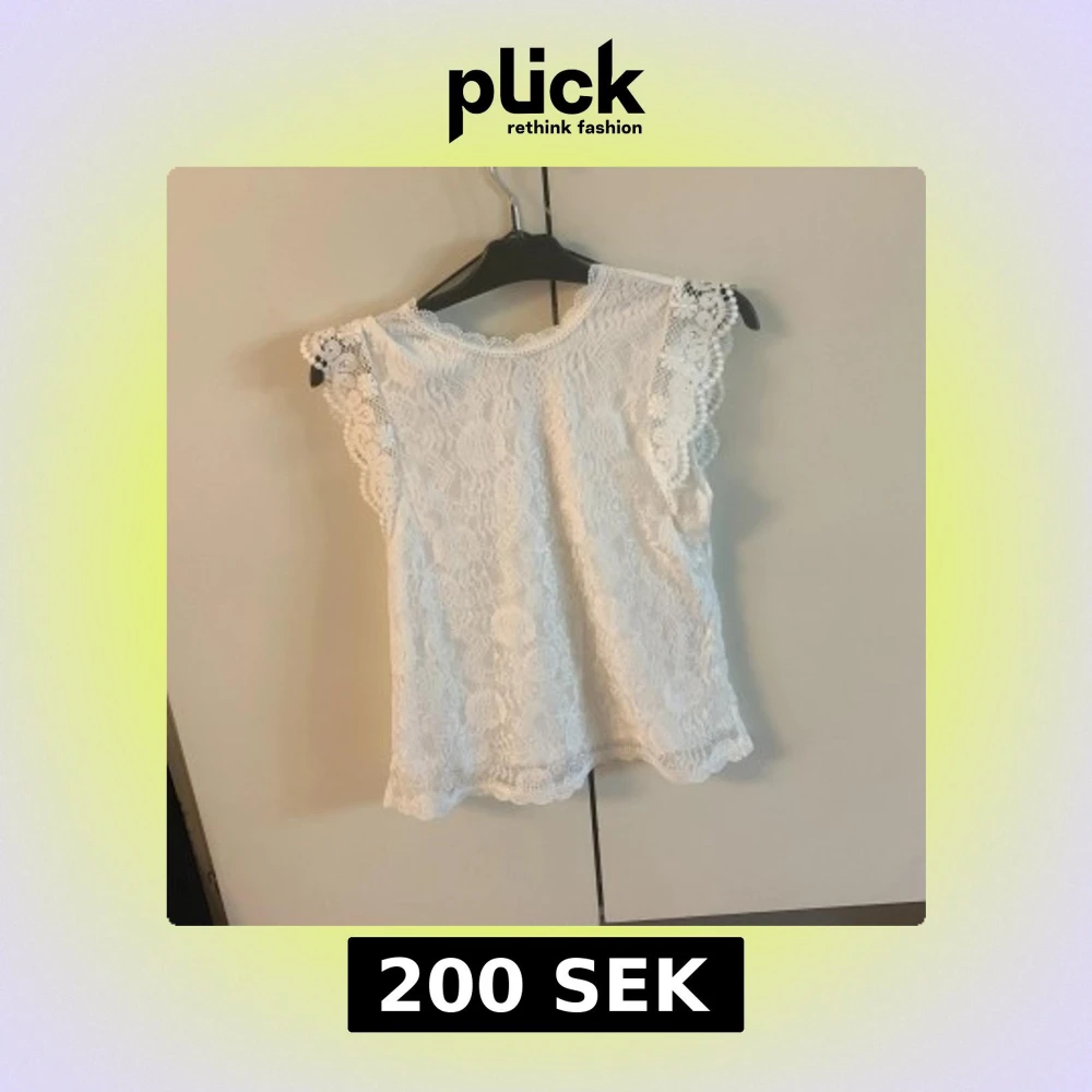 Säljer en söt vit blus från Vero Moda i spets med fina volangdetaljer vid ärmarna. Blusen är ärmlös och har ett romantiskt mönster i spets över hela plagget. Perfekt för vår och sommar!