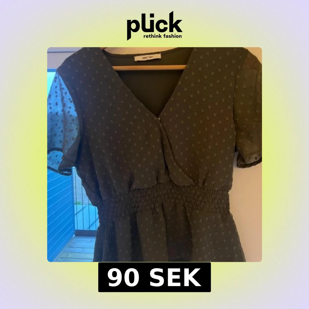 Supersöt grön blus från About You med små prickar och markerad midja med smock. Blusen har korta ärmar i transparent tyg och v-ringad hals. Perfekt för vår och sommar!