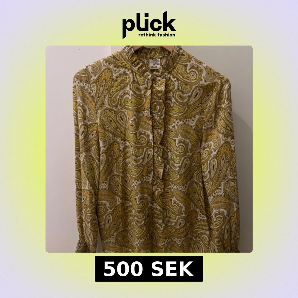 Underbar blus med ett vackert paisleymönster i gult och vitt. Blusen har en hög krage med volang och en smickrande volangdetalj längs knappslån. Ärmarna är långa och avslutas med resår. Går bra att hämtas i västra Göteborg.