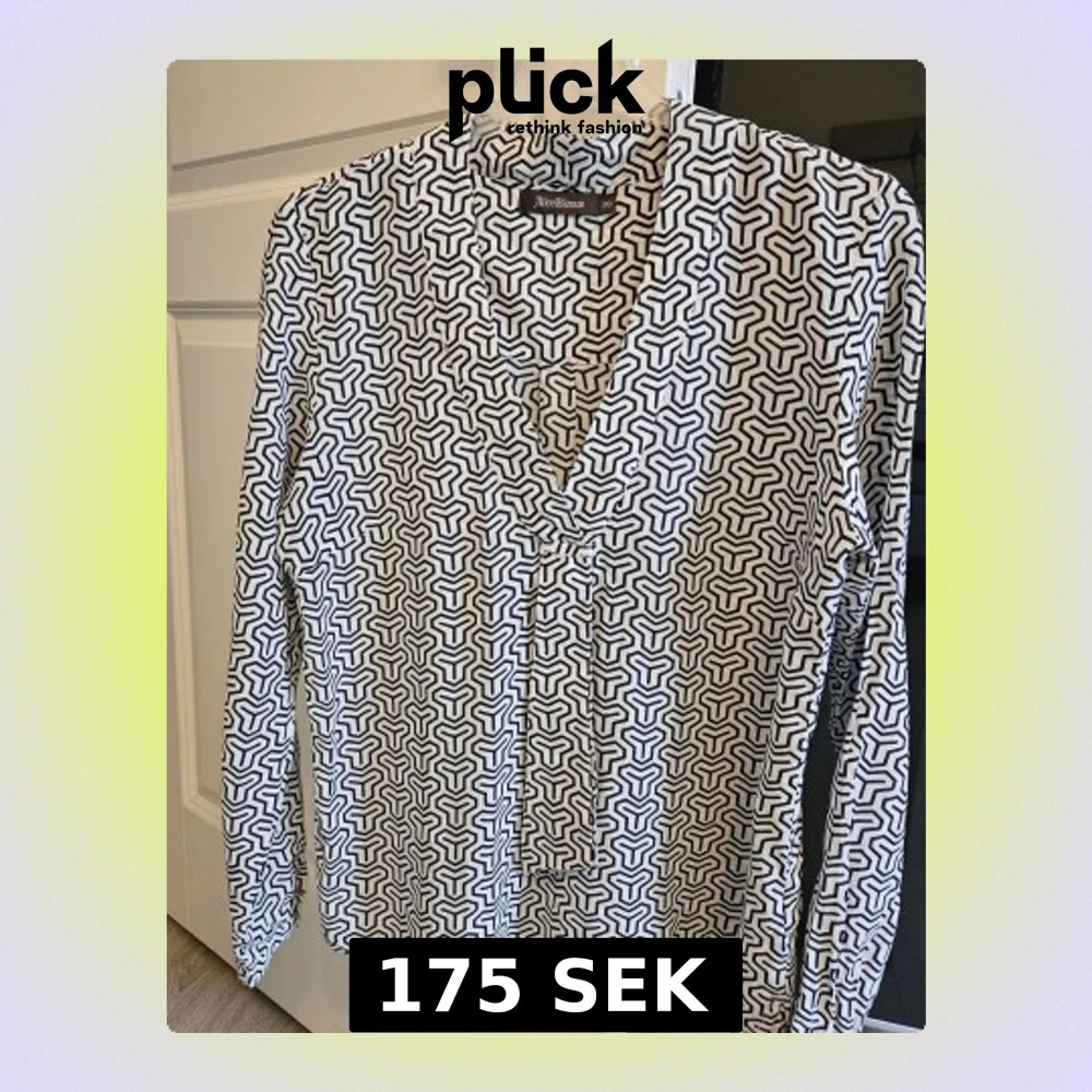 Svart och vit långärmad blus med ett geometriskt mönster. Blusen har en v-ringning och knäppning framtill.