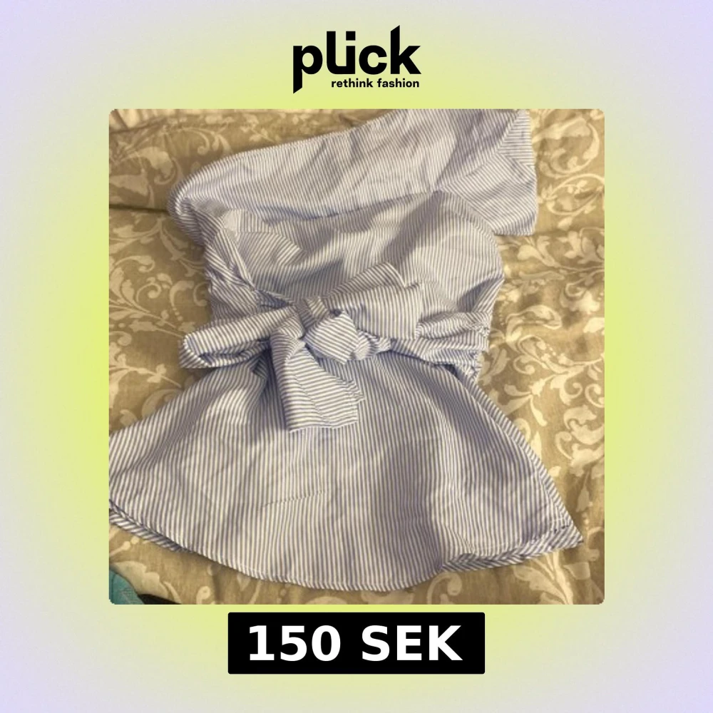 Supersöt kort blus i blåvitt randigt med knyt i midjan och offshoulder-modell med en axel. Perfekt för varma dagar och har en luftig känsla. Gjord i mjuk bomull som känns skön mot huden. Snygg och trendig look med elastisk detalj för extra komfort. Aldrig använt denna, men den har ett hål vid dragkedjan men kan enkelt sys ihop💓