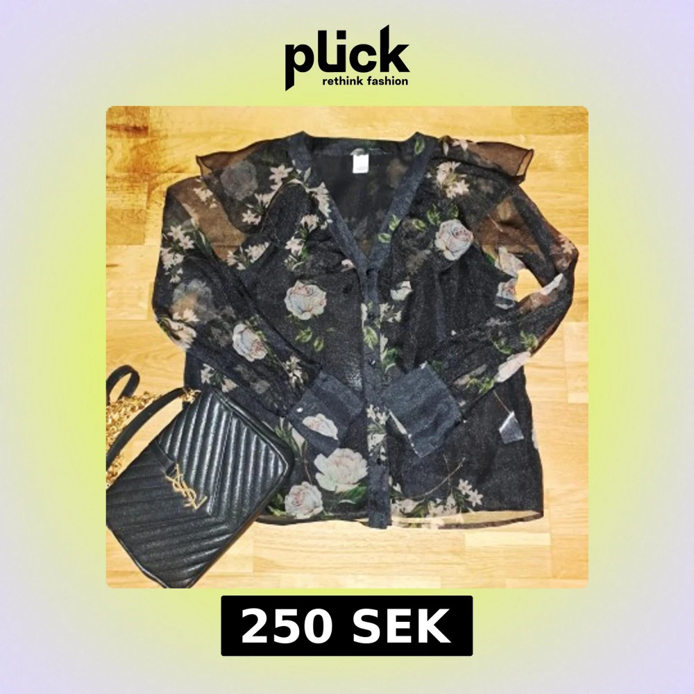 Snygg svart transparent skjorta från Visual Clothing Project med blommigt mönster i ljusa toner. Skjortan har v-ringning, knappar framtill och långa ärmar. Perfekt för dig som vill sticka ut med en trendig och luftig look. Underbar Visula Clothing project blus i skirt tyg på armar men täckande över kroppen. Volang krage och så fin 😍 är M och passar S också. Finare i verkligheten ☺️