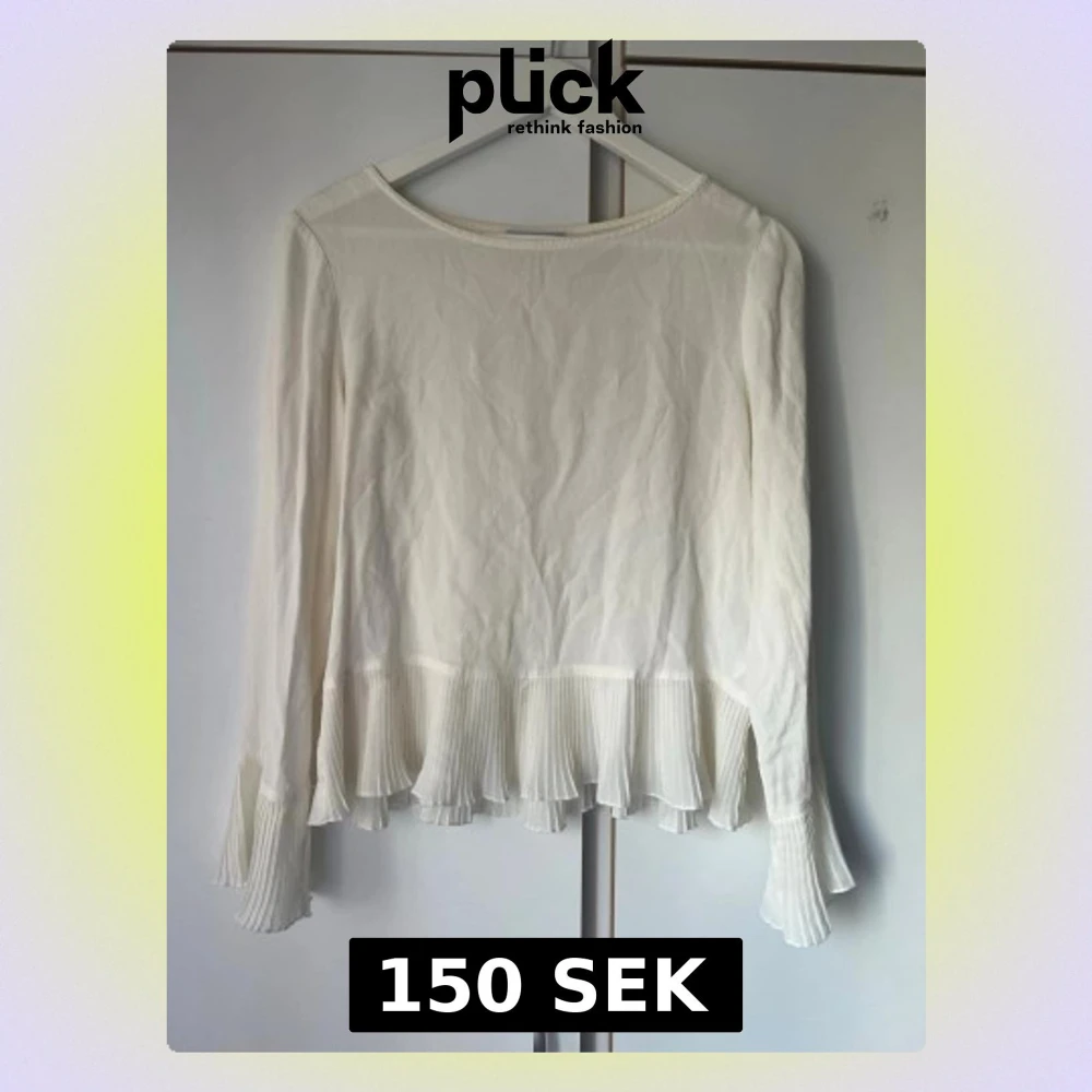 Snygg vit blus med långa ärmar och plisserad volangkant både nedtill och vid ärmsluten. Blusen har en rak passform och rund halsringning. Perfekt för en stilren och trendig look.