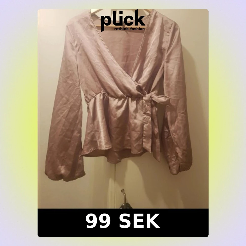Snygg ljuslila omlottblus i glansigt material med långa ärmar och volang nedtill. Blusen har ett knytband i midjan som ger en feminin siluett och djup v-ringning. Perfekt för dig som gillar trendiga och eleganta plagg. Storlek: M