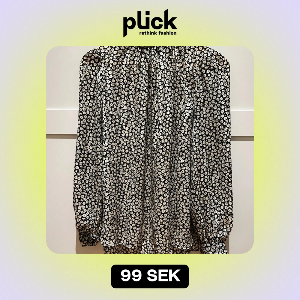 En fin blus med blommor i botten , tre knappar i nacken och snygg stående krage . Även knappar runt armleden som ytligare en fin detalj .