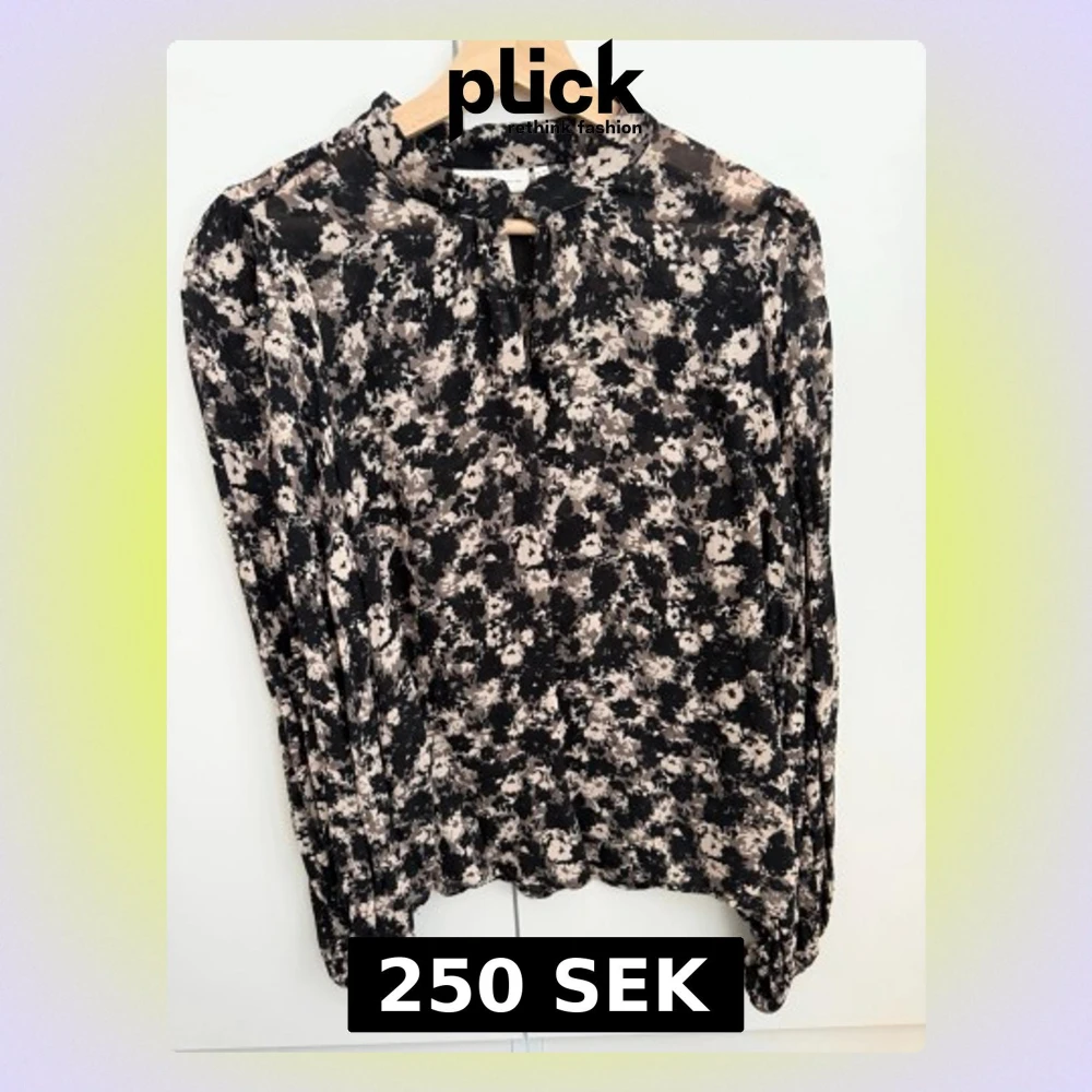 Trendig blus med svart och beige blommönster, rund halsringning och liten knytning fram. Långärmad modell med lätt puff vid axlarna och smala muddar vid ärmslut. Perfekt för dig som gillar en stilren men ändå lekfull look.