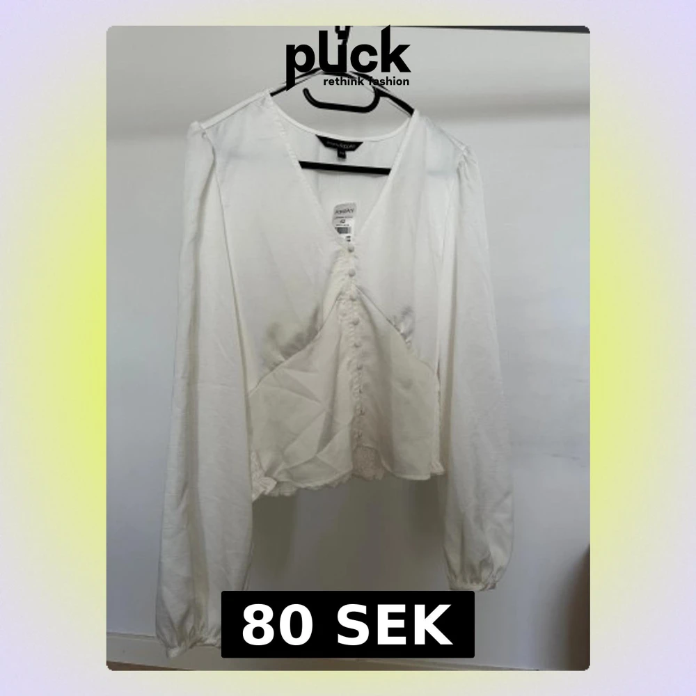 Säljer en vit blus från KappAhl i storlek 42. Blusen har v-ringning, långa ärmar med resår vid ärmslut och dekorativa tygklädda knappar framtill. Smockad och volangkantad nederdel baktill Obs: Alla plagg säljs endast fram till 28/12