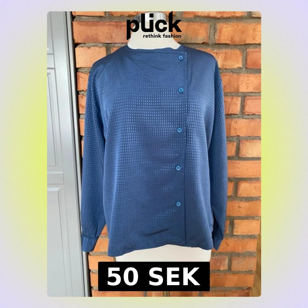 Stilren blå blus med diskret rutmönster och asymmetrisk knäppning framtill. Blusen har långa ärmar med knapp vid ärmslut och är tillverkad i ett glansigt, mjukt material som ger en elegant känsla. Perfekt för dig som gillar en unik twist på klassiska plagg.