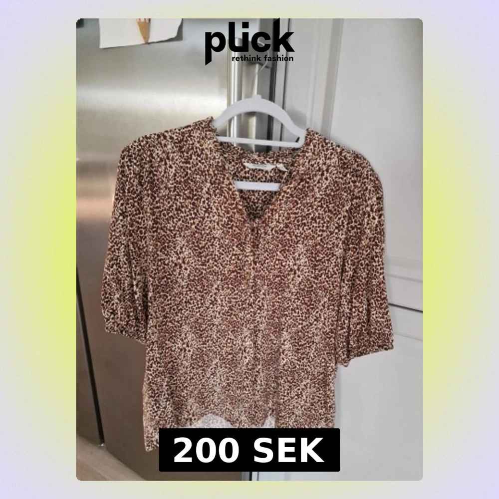 Säljer en snygg blus med brunt och vitt leopardmönster. Materialet känns mjukt och följsamt, perfekt för en trendig look. Passar till både jeans och kjol.