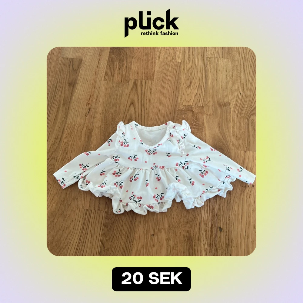 Söt vit blus med blommönster i rosa och grönt. Blusen har långa ärmar och volangdetaljer, perfekt för små barn. Tillverkad i mjuk bomull med lite stretch för bekvämlighet.