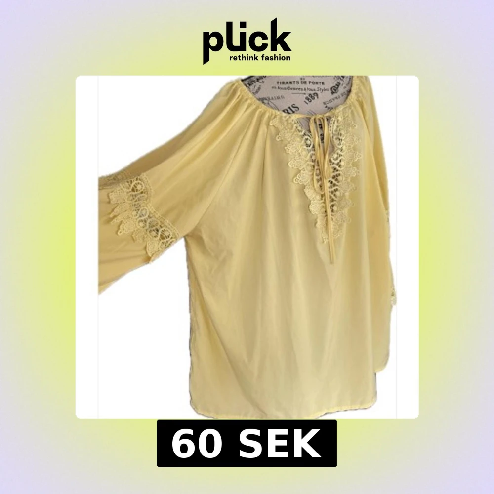 Gul blus med lång ärm och spetsdetaljer vid halsringningen och ärmsluten. Blusen har en avslappnad passform och knytband i halsen.