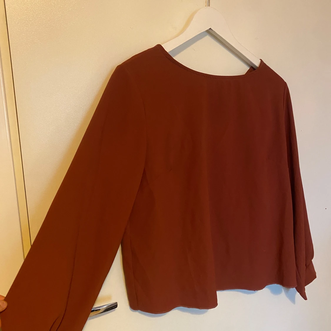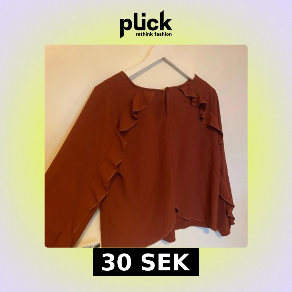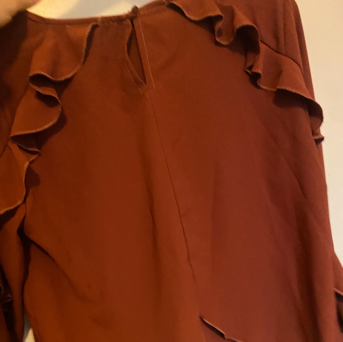 Säljer en snygg vinröd/orange/brun blus med volangdetaljer längs ärmarna. Blusen har långa ärmar och en rund halsringning. Perfekt för en stilren look. OBS första bilden är baksidan, det är baksidan som har volanger.