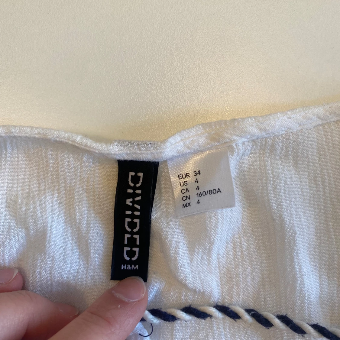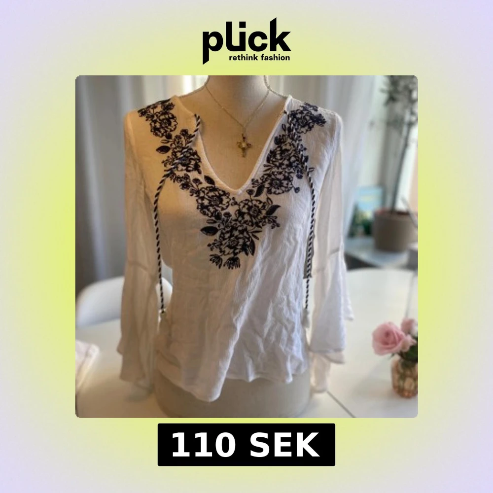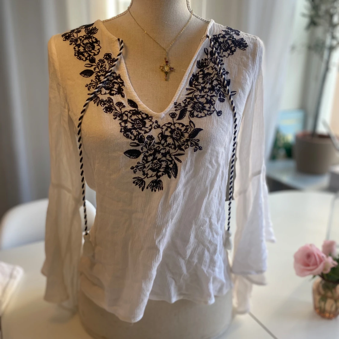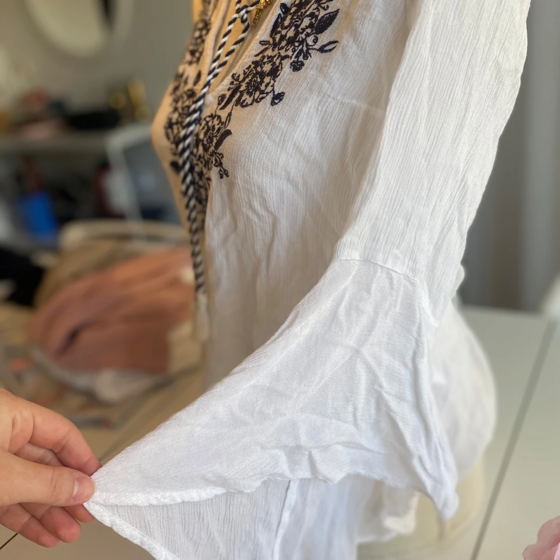 Super fin asymmetrisk vit blus med svart broderi och volangiga armar!😊 perfekt för våren, vardagen, och festliga event🩷 märket är divided och storleken är 34/XS men passar även S.