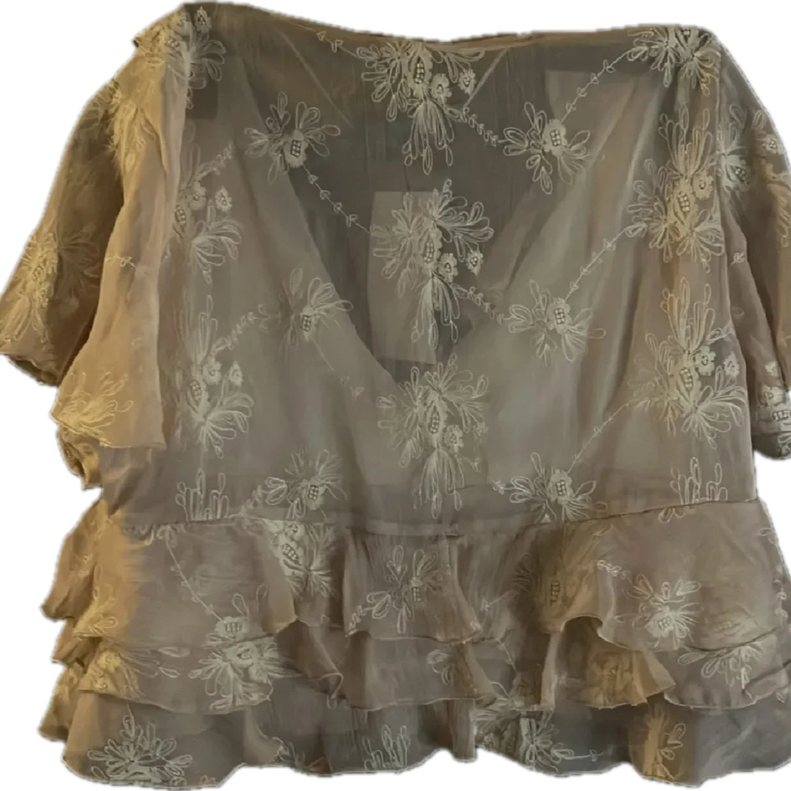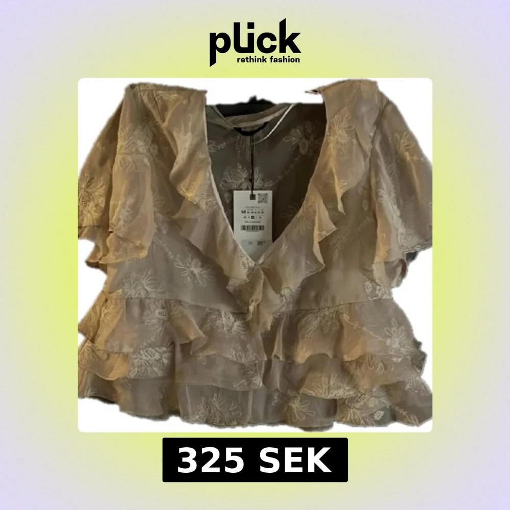 Säljer en romantisk beige blus från Zra i storlek M. Blusen har broderade blommor, volanger och v-ringad hals. Materialet är lätt och transparent med korta ärmar. Perfekt för dig som gillar feminina detaljer och en luftig känsla. ord pris: 390 sek, säljer för 325 på grund av att den är nyköpt.