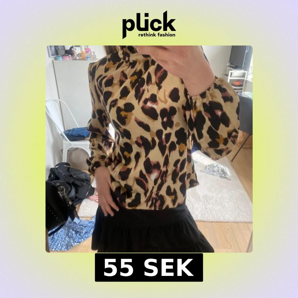 Trendig beige blus med leopardmönster. Ståkrage och lätt glansigt material ger en cool look.
