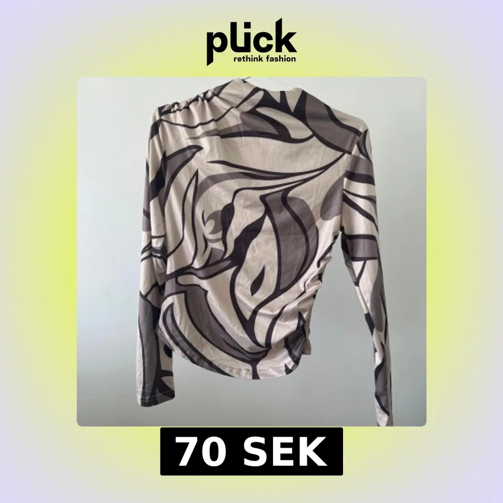 Säljer en unik beige topp med abstrakt brunt mönster. Den har långa ärmar och en figurnära passform. Perfekt för att ge din outfit en konstnärlig touch.
