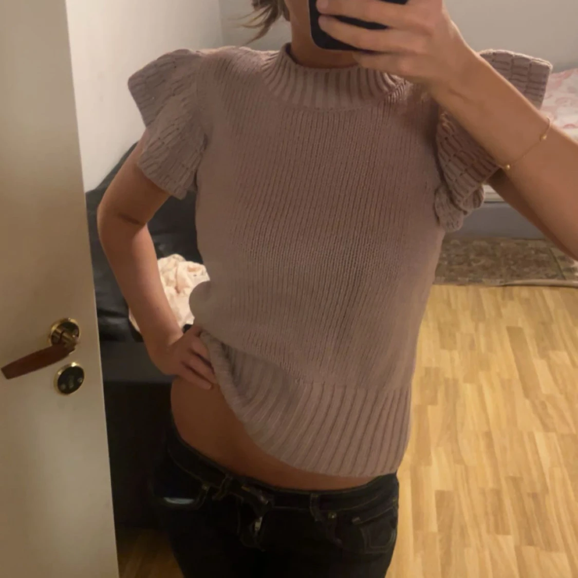 Supersöt stickad topp i ljusrosa från Holly & Whyte. Modellen har korta ärmar med volangdetalj och ribbad struktur vid hals och nederkant. Supersnygg med både jeans och kjol! Köptes från Lindex för 800kr, nästan aldrig använt men har fått så många komplimanger när jag haft på mig den❤️❤️